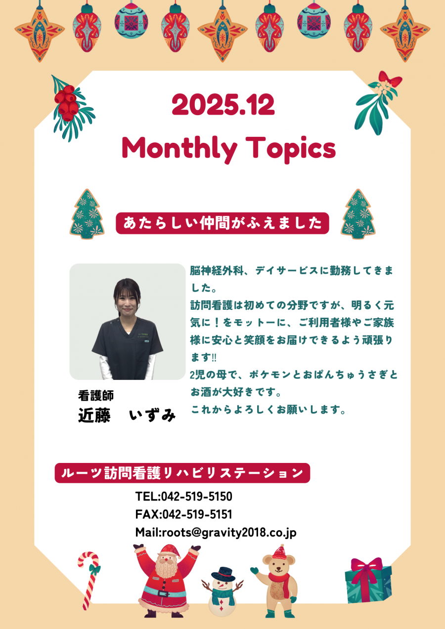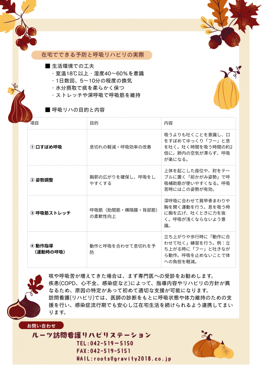 ルーツ訪問看護リハビリステーションでは、昭島市より業務委託を受けて、『地域リハビリテーション活動支援事業専門職派遣』に登録をしています。地域のサロンよりご依頼を受けて、当スタッフがサロンへ赴き、テーマに沿った内容でお話をさせて頂きます。今回のテーマは「健康維持のための口腔・嚥下について」で、昭島市民交流センターをお借りして、50名ほどの勉強熱心な60~90歳代の方々の前でお話をさせていただきました。参加された方からは、「自宅でも続けたい」「帰ったら夫にも教えよう」といった声がきかれましたが、今後も継続して経過を追っていけるようなやり取りができるよう積極的にサロンでの活動を行っていきます。